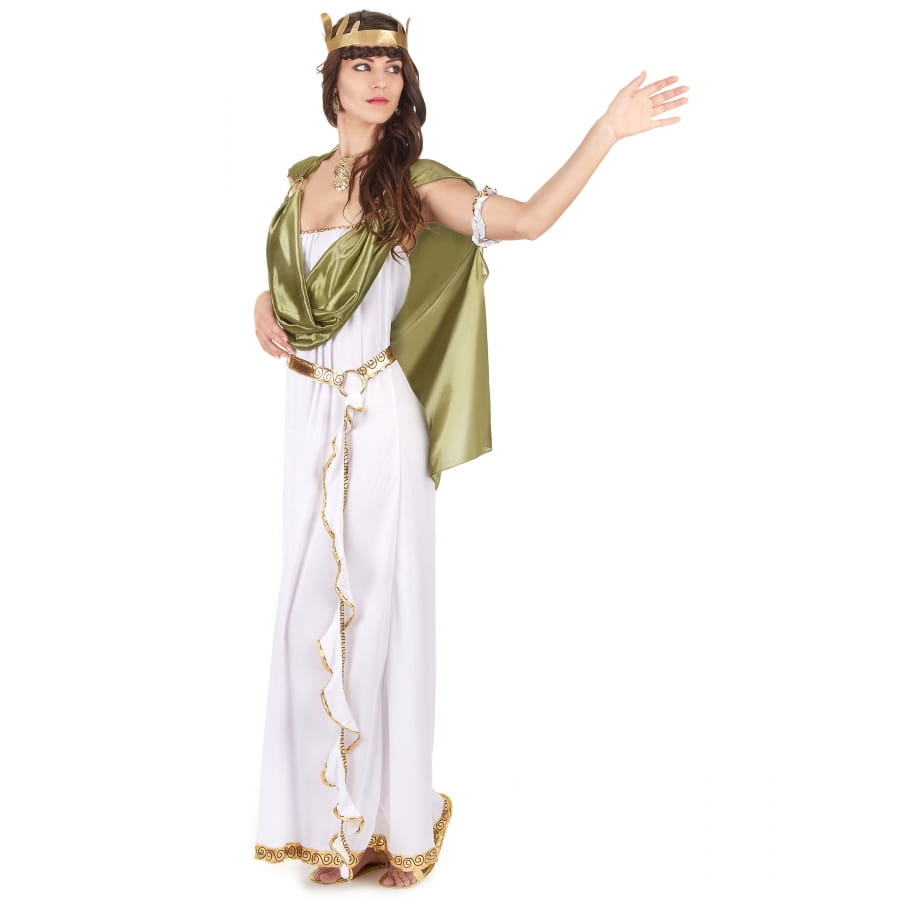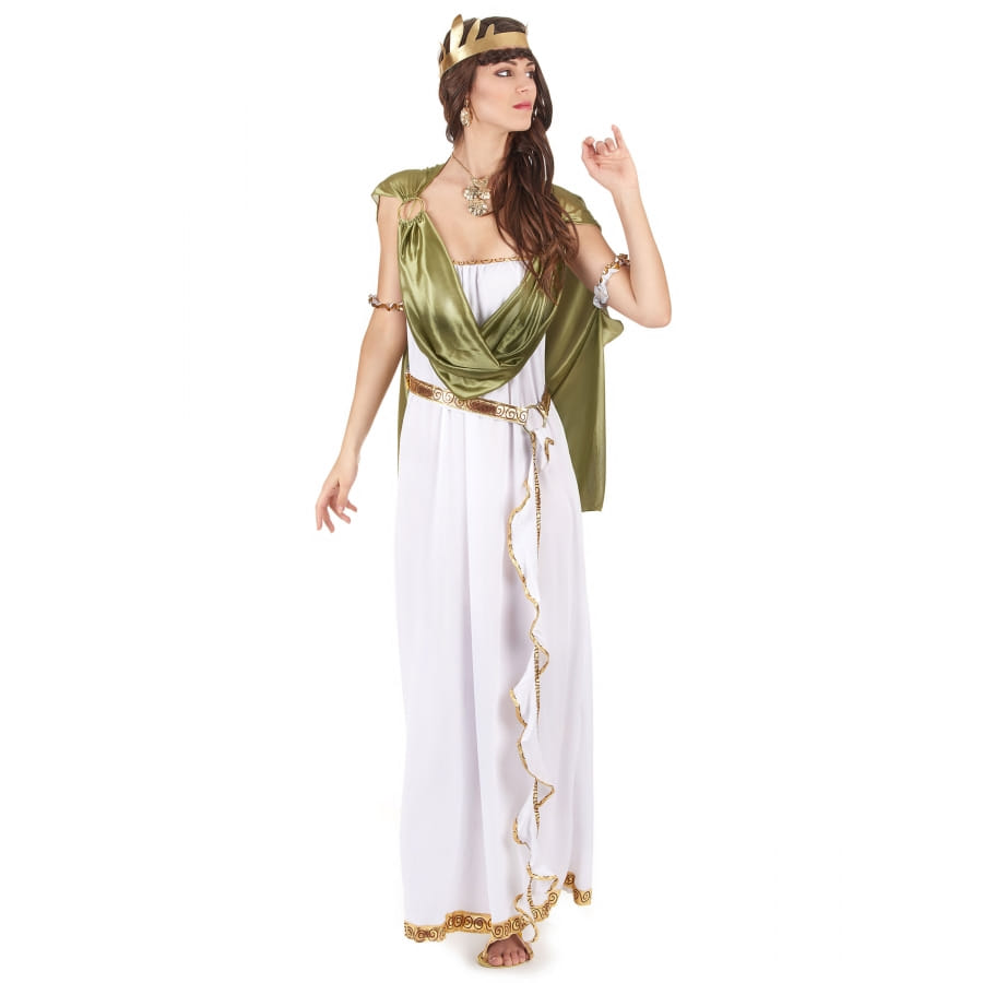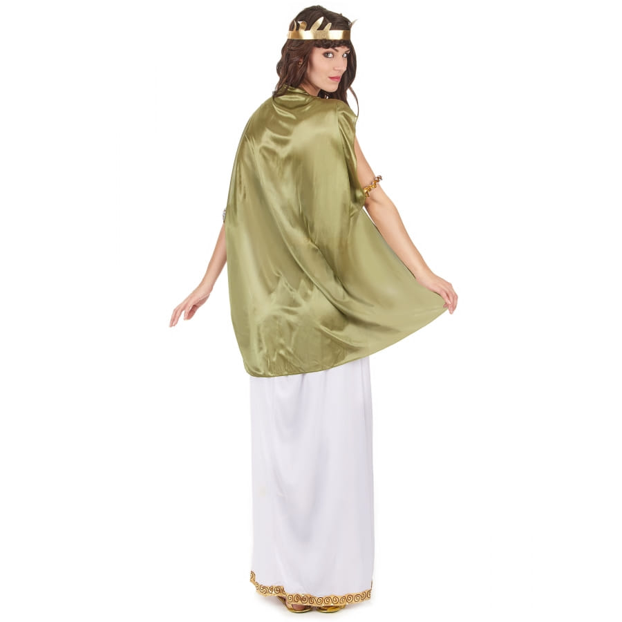 Devenez la réincarnation d'une déesse grecque ou romaine pour une soirée à thème. Faites honneur à une personnalité historique dans ce long déguisement blanc de déesse, toge verte. Vous porterez une longue robe bustier, élastique au niveau de la poitrine. Le tissu est fluide et très agréable à porter. La robe est blanche et agrémentée de liserés dorés. Une ceinture dorée est fournie pour cintrer la taille et sublimer les hanches, avec la pièce de tissu torsadée blanche liserée de dorures. Elle se fixera à l'aide d'un scratch. Une toge verte en tissu satiné vient recouvrir les épaules. Une cape avec bracelets élastiques intégrés habillera votre dos et accompagnera vos mouvements. Les anneaux en plastique servent de liens pour maintenir les différentes pièces de tissu. Une couronne de laurier de couleur dorée viendra accessoiriser votre coiffure afin de vous transformer en véritable divinité !