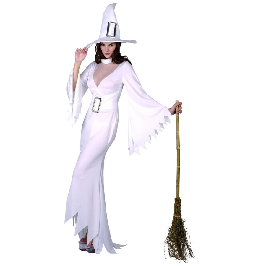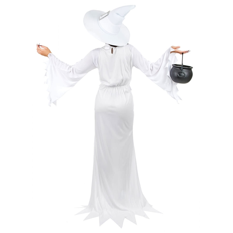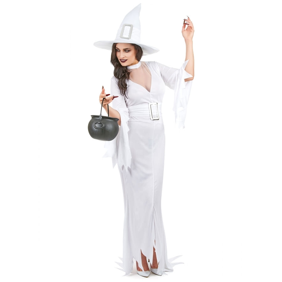 La fête d'Halloween grouille de sorcières. Vous pouvez jouer à la diva dans ce long déguisement blanc de sorcière, pour femme. Une somptueuse robe de couleur blanche est mise à votre disposition. Il s'agit d'une robe moulante, présentant un aspect fluide, avec de longues manches évasées, ainsi que des bords à contour découpé. La robe est complétée par une large ceinture avec boucle, de couleur assortie. N'oublions pas non plus l'authentique chapeau pointu de sorcière. Celui-ci est aussi de couleur blanche. Vous deviendrez la reine des sorcières grâce à cette élégante tenue. Notez que maquillage et vernis vous sont également proposés sur Happyfete pour vous permettre de personnaliser ce déguisement.