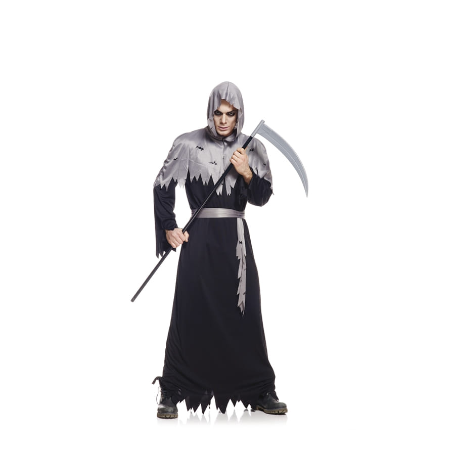 La mort est toujours dans les parages quand survient le soir d'Halloween. Faites de la faucheuse votre alliée cette année en essayant ce long déguisement de la mort pour homme adulte. Vous incarnerez un personnage effroyable dans cette longue et magnifique tunique de couleur noire et grise. Ses manches sont longues et ses bords affichent une allure découpée. Une capuche est rattachée à la tenue. Elle est aussi de couleur grise. Maquillage et accessoires sont de rigueur si vous voulez parfaire le déguisement. Pour réussir votre métamorphose, vous pouvez jeter un oeil à notre section accessoire, et y dégoter une arme blanche de faucheuse. Vous deviendrez ainsi le féroce meurtrier d'Halloween !