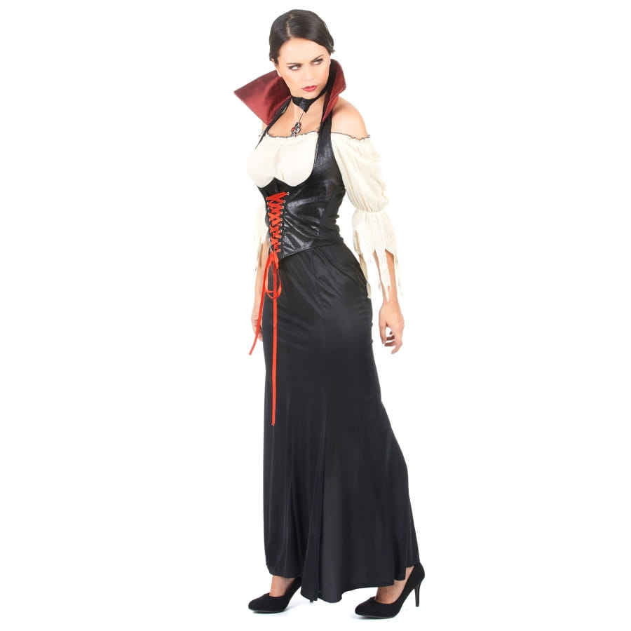 A l'occasion de la fête des morts, pourquoi ne pas miser sur l'originalité de votre costume ? Pour ce faire, nous vous soumettons ce long déguisement de vampire avec corset. Il reste disponible sur notre site. Il se compose d'une chemise de couleur blanche à épaules dénudées. Par-dessus celle-ci se porte un gilet noir, fait de faux cuir. Il présente un laçage rouge et se prolonge en un grand col montant de couleur rouge également. Le bas de la tenue est une longue jupe de couleur noire, conçue dans un tissu souple à effet satiné. Un tour de cou noir, avec un pendentif en forme de croix, pourvu de fausse pierre, accompagne l'ensemble.