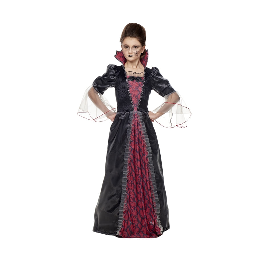 Jeunes filles, dévoilez votre côté vampire lors d'une soirée d'Halloween. Avec ce long déguisement élégant de vampire pour fille, vous deviendrez la reine des créatures mystiques d'Halloween. Cette longue et élégante robe est prévue pour les jeunes demoiselles coquettes. Elle est de couleur noire et rouge, et de nature imprimée. Son style original tient de ses manches en tissu et en tulle, toutes deux de nature transparente. Rajoutez à cela un grand col noir et rouge imprimé, bien relevé à l'arrière façon vampire. Ce modèle de distinction pourra servir à toutes sortes d'occasions comme Halloween, un carnaval, une pièce de théâtre, etc. Personnalisez-la avec une touche de maquillage et votre petite fille sera, en un mot, impeccable !