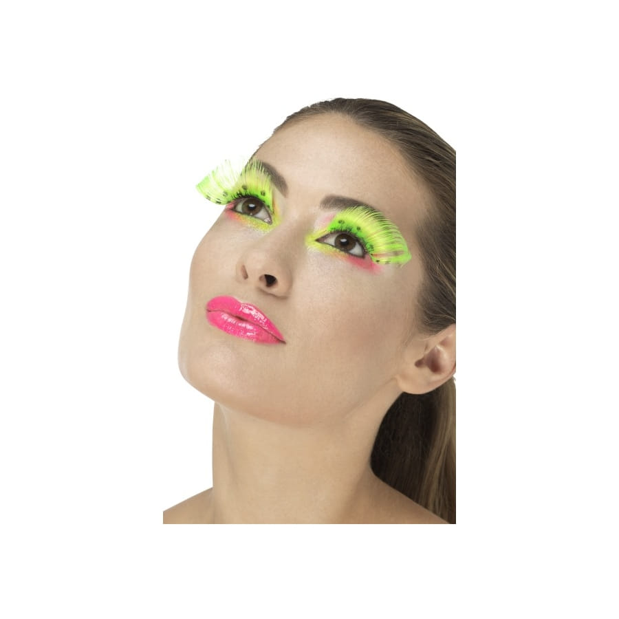 Habillez vos yeux pour le carnaval. Vous pouvez avoir un look très original rien qu'en misant sur votre regard. Procurez-vous ces longs faux cils verts fluo à pois, 80's. L'article est constitué par des faux cils d'une longueur remarquable. Ils sont de couleur vert fluo avec des pois noirs. De la colle vous sera fournie pour une fixation efficace et sans danger.