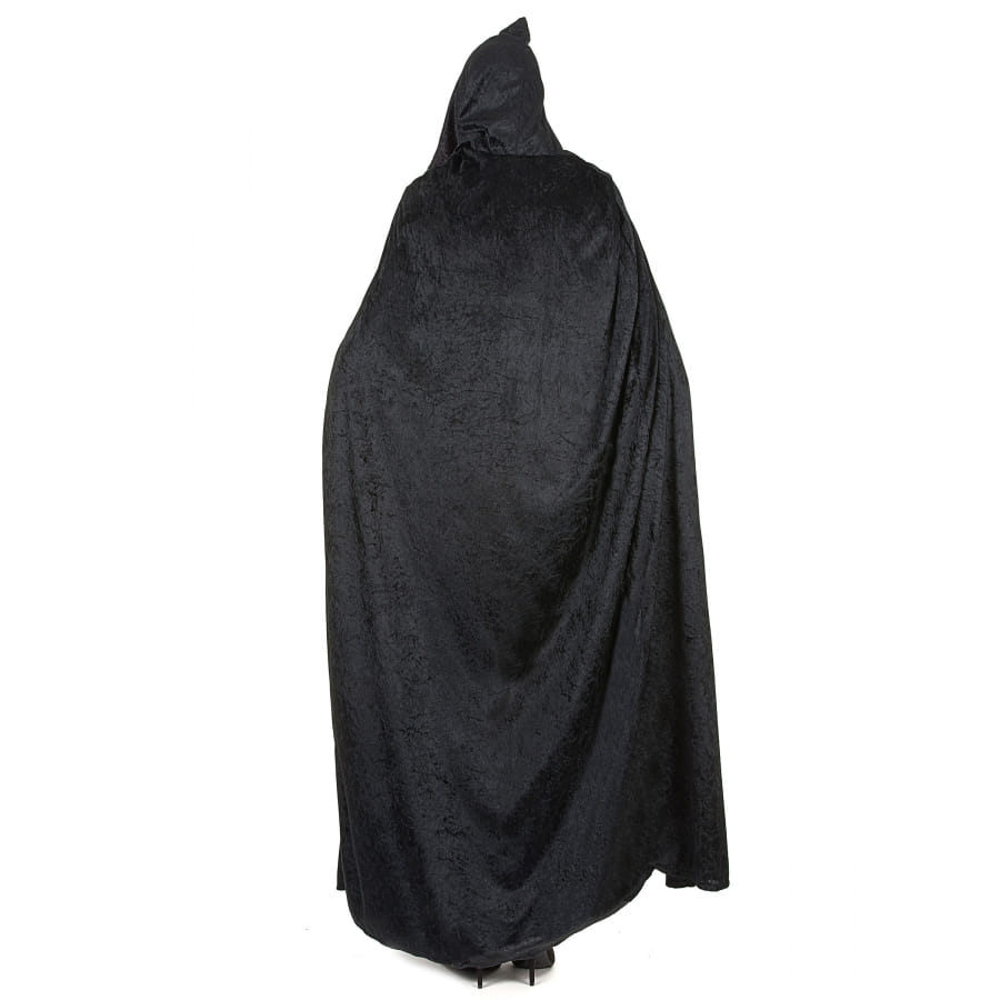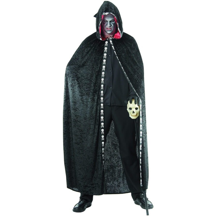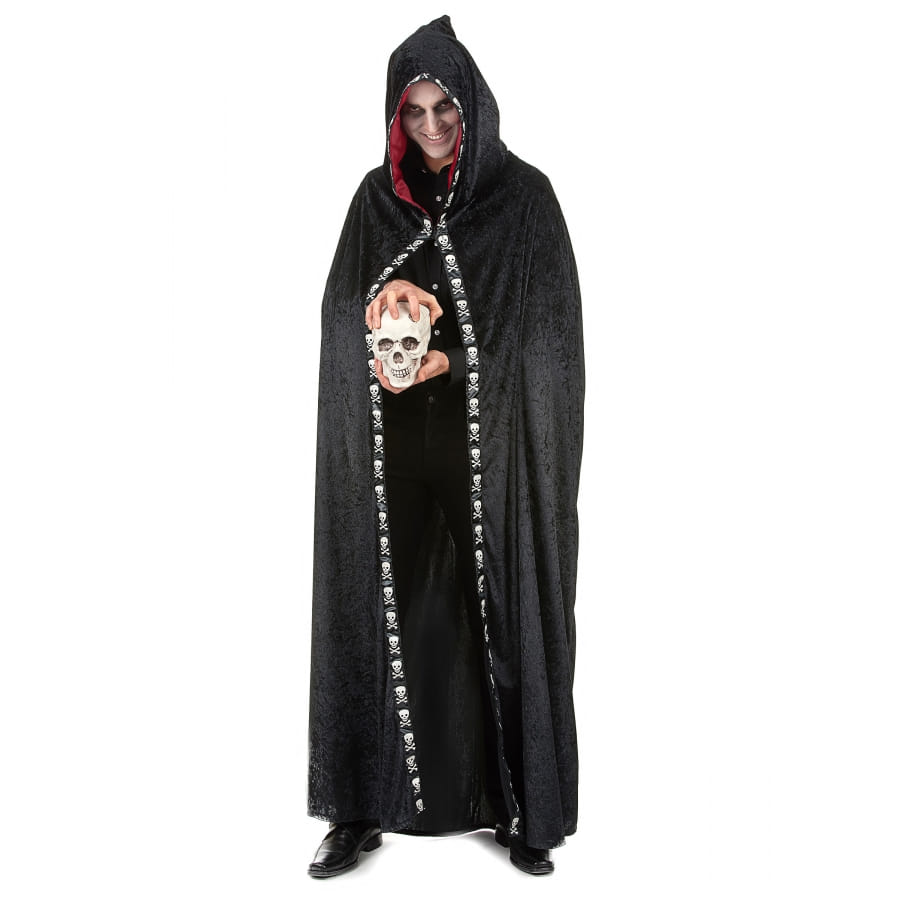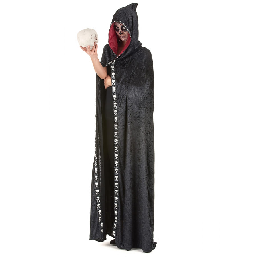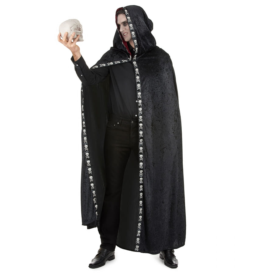 Nous vous proposons la longue cape à capuche noir liseret squelette qui est fait d'une longue cape noire dont le centre est orné d'un galon composé de plusieurs têtes de morts blanches.