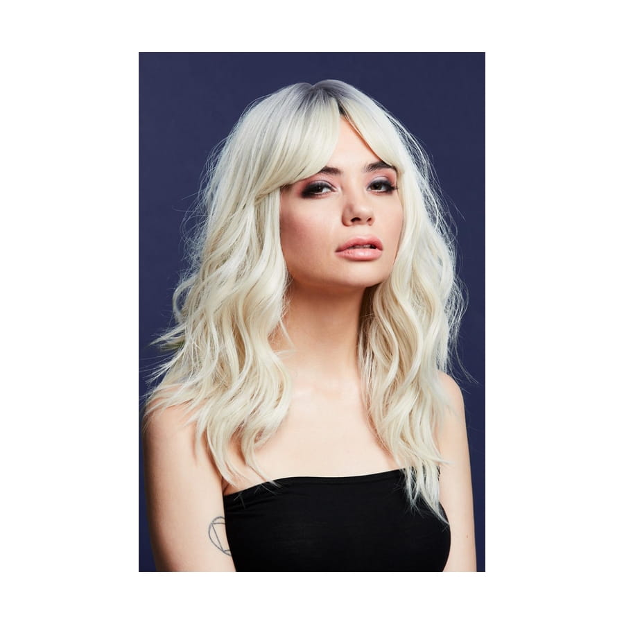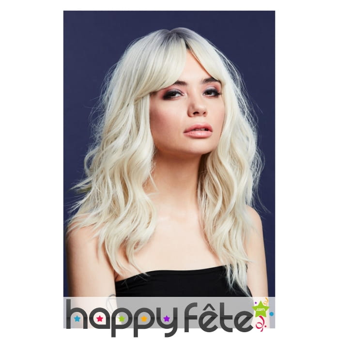 Longue de 48 cm environ, cette perruque agence des couleurs blond clair et noir au niveau des racines.