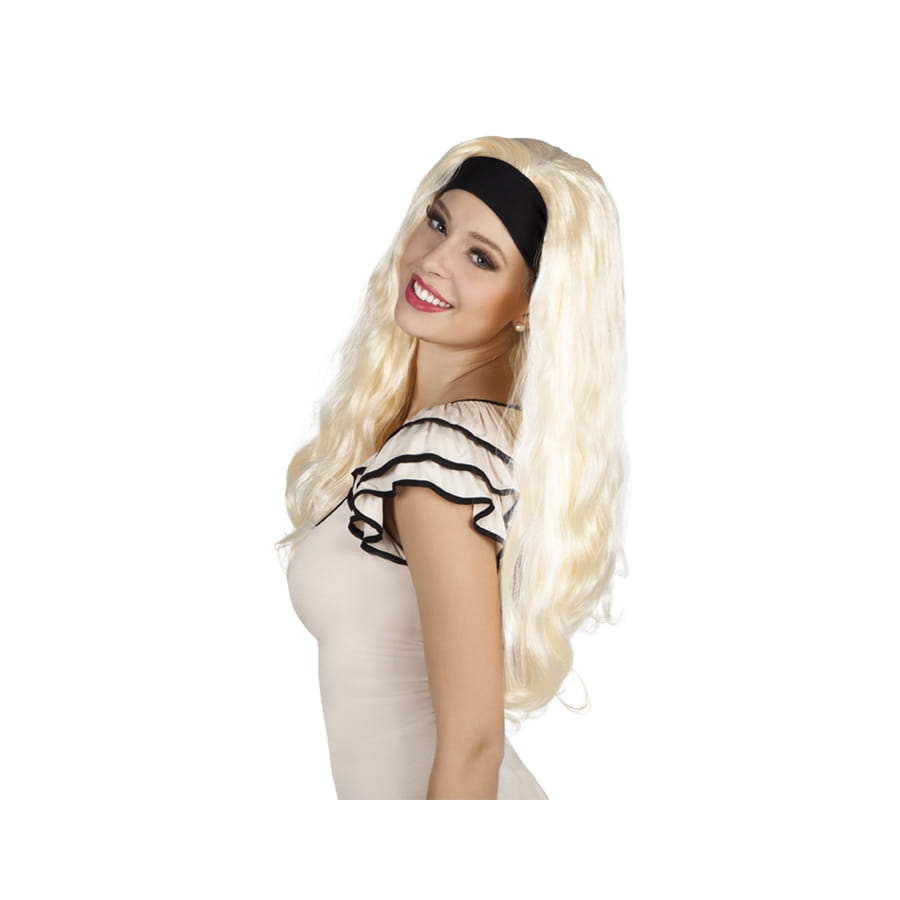 Une longue chevelure blonde vient encadrer votre visage. Devenez une ravissante pin-up des années 50-60 en portant cette longue perruque blonde avec bandeau noir. Vous aurez de longs cheveux d'un magnifique blond doré, légèrement ondulés. Le bandeau est de couleur noire et bien épais. Résultat, vous aurez une toute nouvelle tête pour la prochaine soirée déguisée.