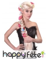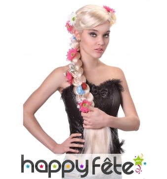 La longue perruque blonde avec large tresse fleurie est faite de cheveux synthétiques.