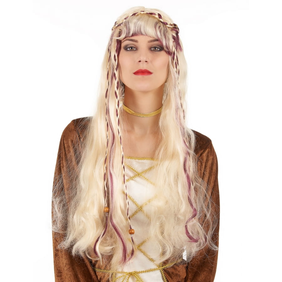 La longue perruque blonde médiévale pour femme est faite de cheveux synthétiques ondulés.