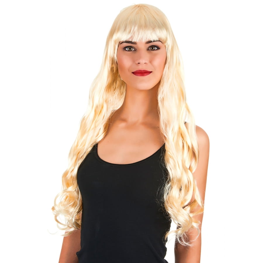 Elle est faite de cheveux synthétiques blonds très clairs et ondulés.