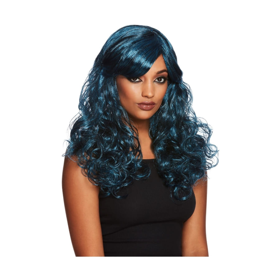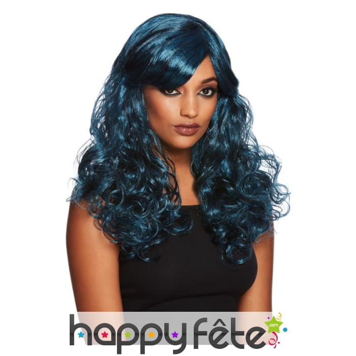 Complétez une tenue de conte de fée avec la longue perruque bouclée noir et bleu pour femme.