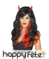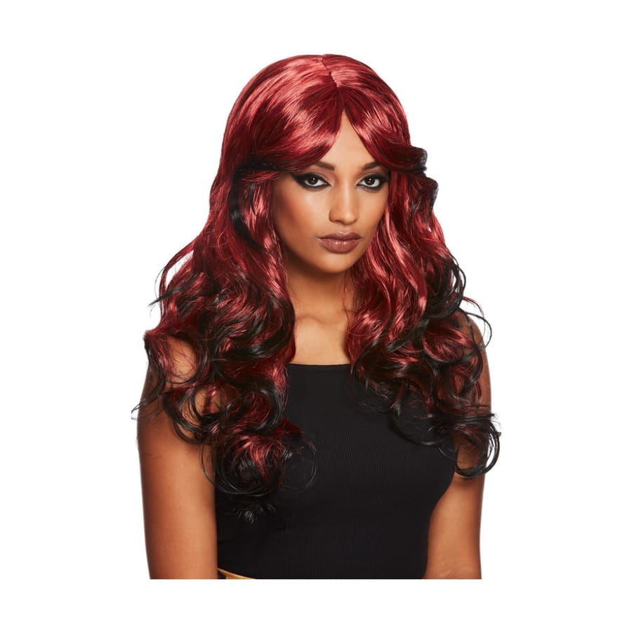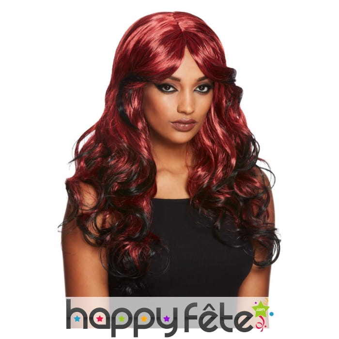 Révélez le côté sombre qui sommeille en vous, grâce à la longue perruque bouclée rouge et noire.