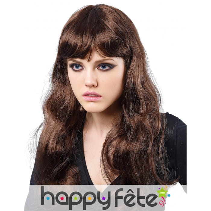 Notre longue perruque châtain ondulée et frange est une coiffure aux longues mèches synthétiques très proches du naturel.