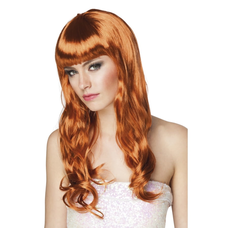 Complétez votre déguisement de femme fatale à l'aide de cette Longue perruque cuivrée ondulée avec frange.