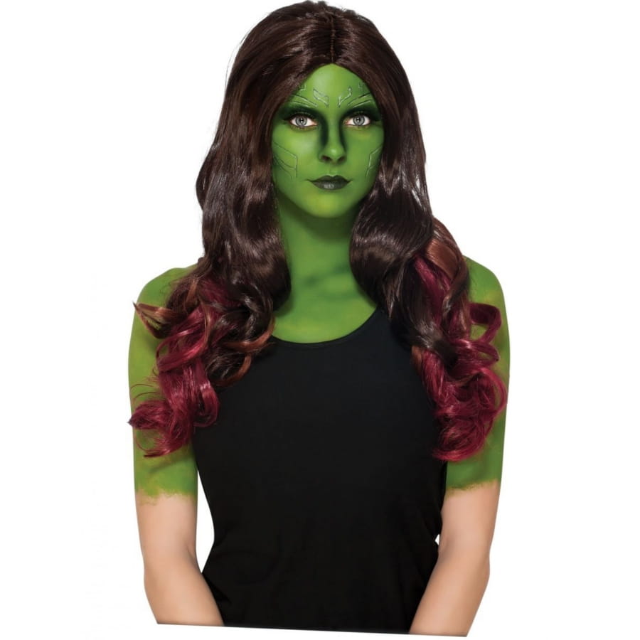 Cette fausse chevelure est coiffée en raie centrale et ses pointes sont teintes en violet en rappel à la coiffure du personnage.