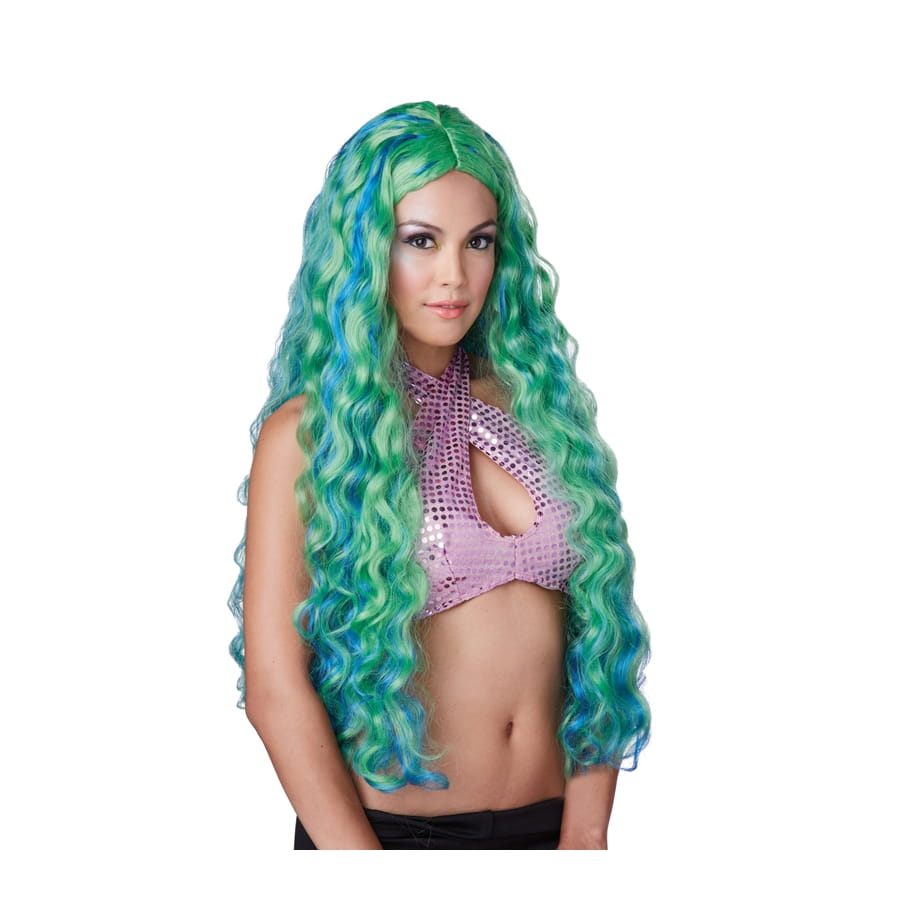 Cette longue perruque de sirène verte bouclée est faite pour celles qui veulent adopter la grande beauté incomparable d'une sirène lors de la prochaine fête déguisée. Celle-ci possède un très joli mélange de vert et de turquoise. Elle est super longue et ondulée sur toute sa longueur. Elle conviendra à tout déguisement de sirène mais aussi à celui d'une fée ou d'un elfe.