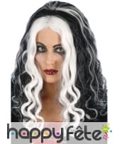 Perruque de fiancée gothique aux cheveux ondulés de couleur noir avec une multitude de mèches blanches, pour femme ou adolescente. Cette perruque vous donnera un air de mort-vivant et sera parfaite avec une tenue de mariée pour Halloween.