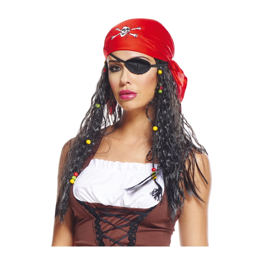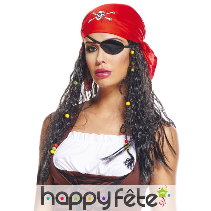 Cette longue perruque noire de piratesse avec bandeau a une longueur allant jusqu'à la poitrine et est constituée d'une coiffure légèrement frisée, avec des tresses sur le devant, ornée de perles multicolores. Un bandeau rouge l'accompagne, à attacher autour de la perruque, et comme sur la photo, vous pouvez rechercher un cache-oeil parmi nos accessoires pour être des plus réalistes.