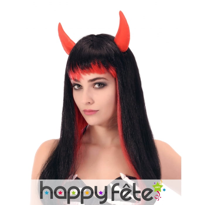Cette fausse chevelure est surmontée d'une paire de cornes rouges.