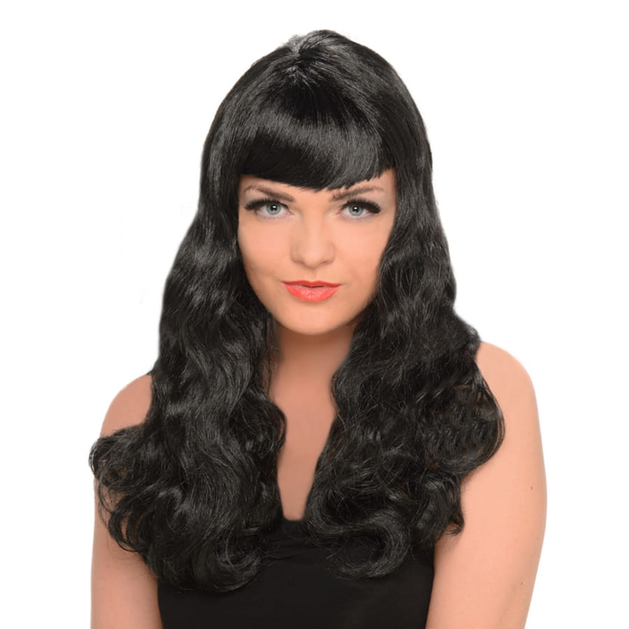 La longue perruque noire ondulée coiffée d'une frange frontale droite et lisse est faite de cheveux synthétiques.