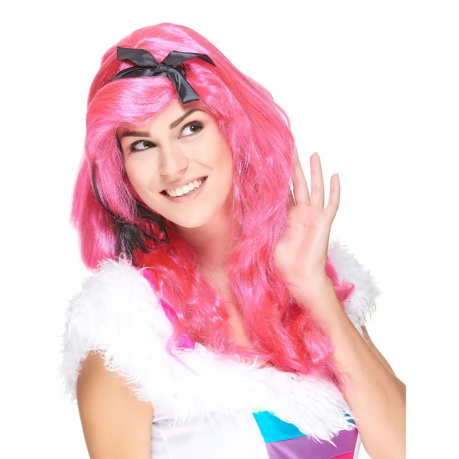 Notre Longue perruque rose fluo avec noeud noir pourrait bien être l'accessoire choc de votre déguisement de sirène ou de fée.