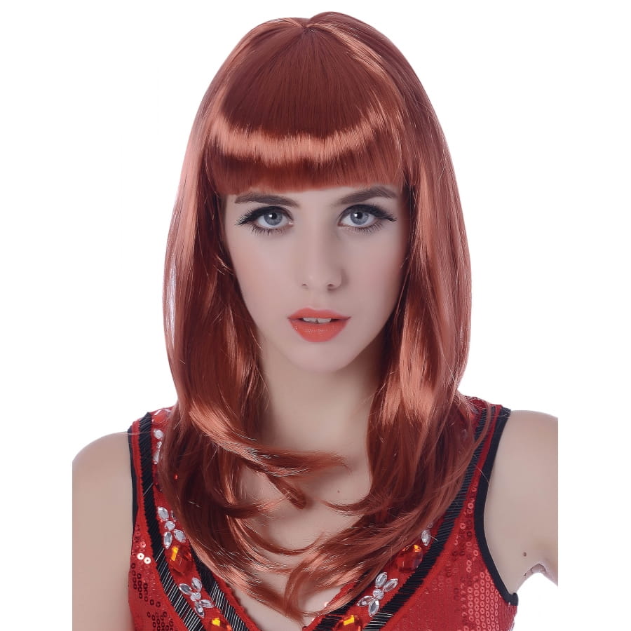 La longue perruque rousse avec frange droite frontale pour femme est faite de cheveux synthétiques.