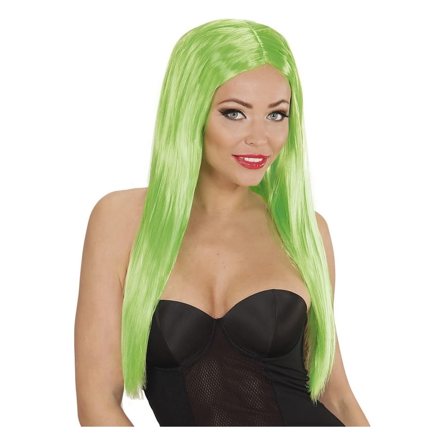 La longue perruque verte lisse avec une raie centrale pour femme est constituée de cheveux synthétiques.