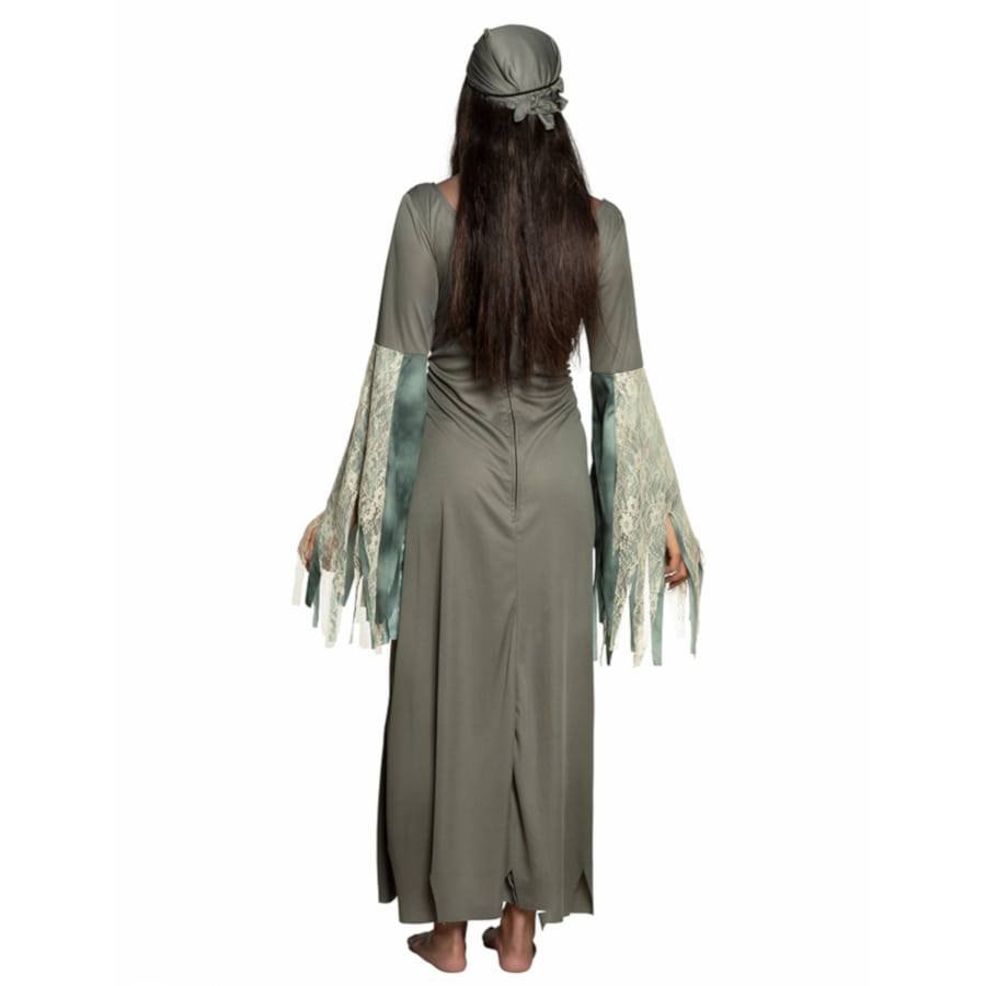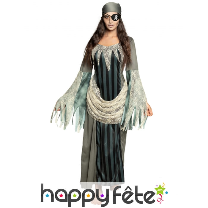 Un bandana entièrement gris verdâtre et un cache-oeil noir orné d'un crâne blanc avec os croisés complètent cette tenue de pirate venue de l'au-delà.
