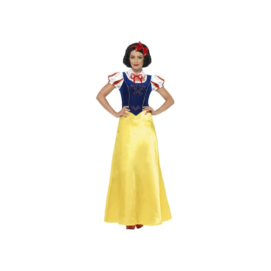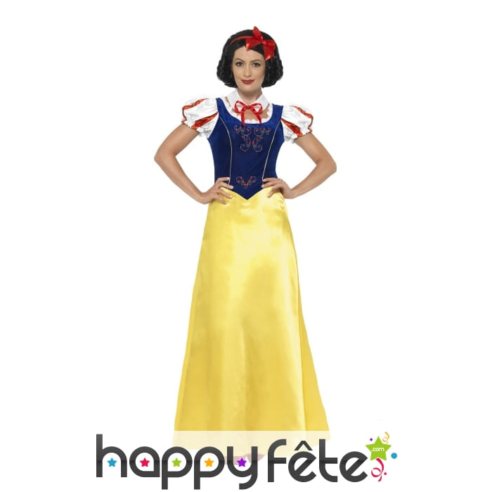 Ce déguisement longue robe de princesse Blanche pour femme adulte est constitué par une robe, un joli petit col et un bandeau rouge noué.
