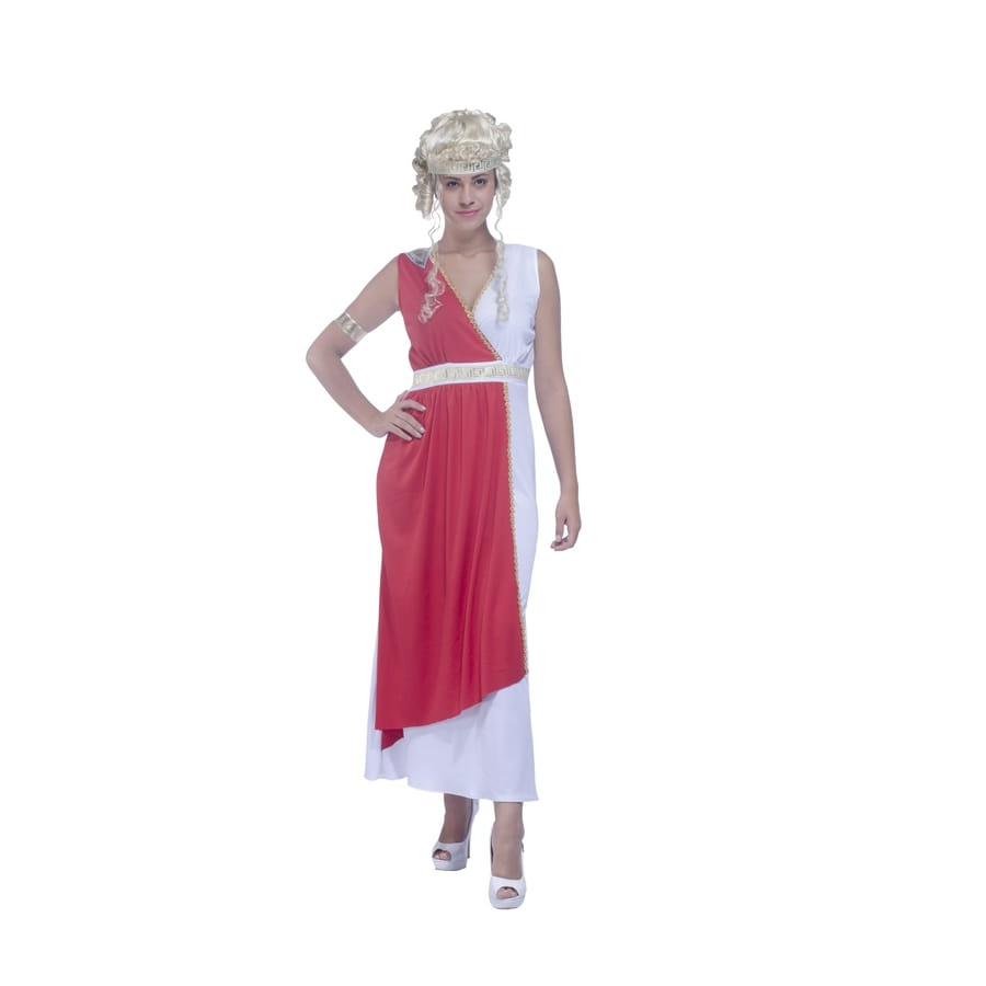 Mesdames, Mesdemoiselles, si vous cherchez une jolie tenue pour une soirée déguisée ayant pour thème Rome antique ou Romantique, nous avons trouvé un déguisement répondant à ces critères. Il s'agit d'un déguisement qui vous permettra de prendre l'apparence d'une citoyenne de l'ancienne Rome. Ce déguisement est composé d'une longue robe de romaine blanche et rouge sans manches : la moitié est rouge et l'autre moitié est blanche. Cette robe drapée très fluide à col V est serrée à la taille par une ceinture blanche intégrée à la robe. Cette tenue est complétée par un joli bracelet argenté et un bandeau. La tenue sera parfaite avec des escarpins blancs.