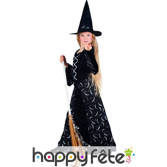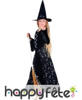 La robe est longue et noire, sublimée par une multitude de croissants de lunes et de petites étoiles sous forme de paillettes argentées, donnant un aspect magique à cette tenue. La partie avant du buste présente un effet velours et un faux laçage gris, ajoutant une touche d'élégance et de mystère à l'ensemble. Les manches évasées sont également décorées des mêmes motifs que la robe, renforçant le côté enchanteur du costume.