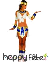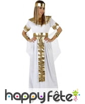 Elle est accompagnée, en son centre, d'une ceinture noire à motifs géométriques dorés et, sur sa partie avant, possède un pan de tissu retombant sur la robe égyptienne.