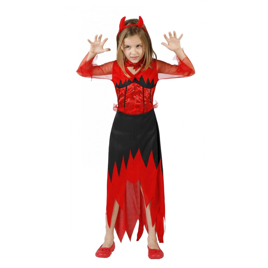 Vous êtes à la recherche d'un costume effrayant pour votre petite fille pour le jour des morts ? Cette robe se prête à cet événement. La tenue est constituée par une robe rouge à la découpe sinistre. Les rebords affichent un effet déchiré. Un tissu satiné avec de jolis motifs orne le devant, et le même tissu est utilisé pour le tour de cou. Le serre-tête rouge avec de petites cornes viendra compléter la tenue.