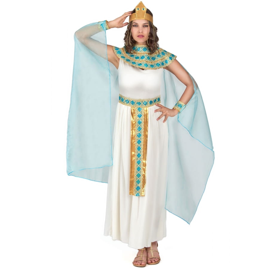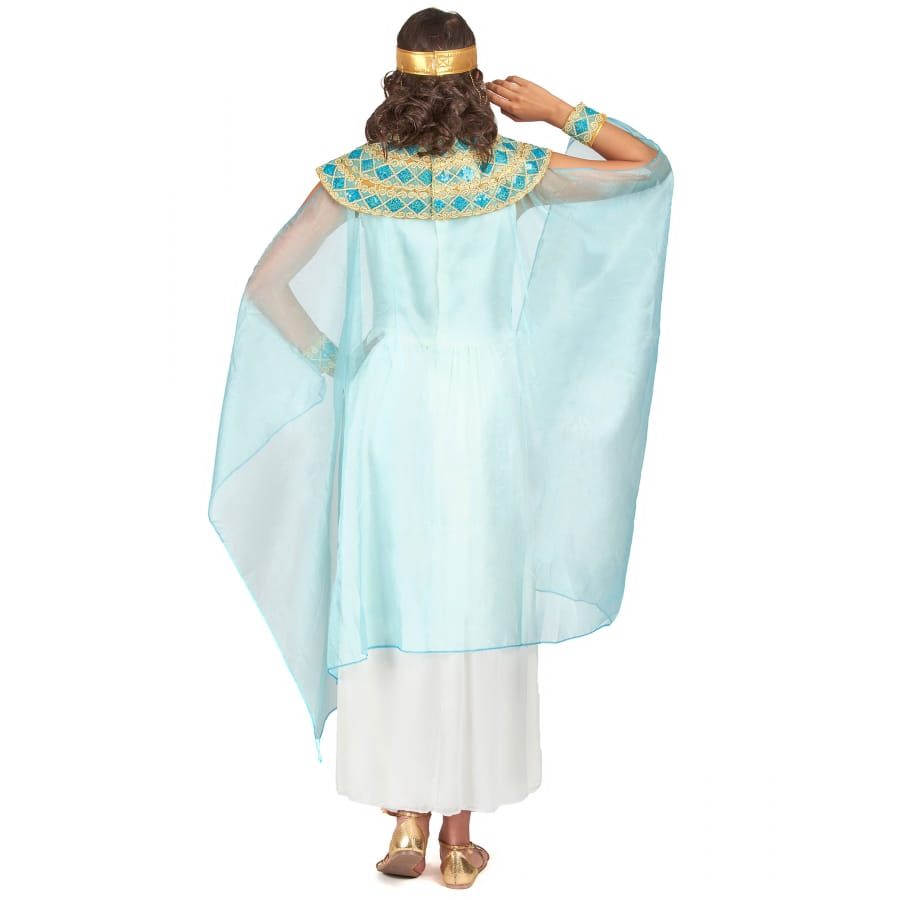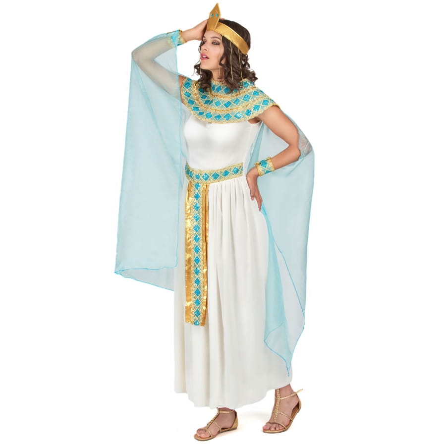 L'Egypte possède des trésors inestimables et la ravissante Cléopâtre en fait partie. Elle constitue un véritable joyau de la royauté égyptienne. Devenez la nouvelle souveraine du pays des pyramides en enfilant cette longue tenue de Cléopâtre pour adulte. Cet ensemble pour femme est formé par une magnifique robe de couleur blanche. Elle est longue et dépourvue de manches. Elle est accessoirisée par un léger voile bleu fixé au niveau des épaules et rejoignant les poignets à l'aide d'une paire de bracelets. Les accessoires sont de couleur assortie. En effet, ceinture, collier et bracelets constituent une parure agrémentée de petits détails de couleur bleue. Pour reproduire la coiffure de Cléopâtre, vous disposerez d'une coiffe couleur or décorée de fausses perles bleues.