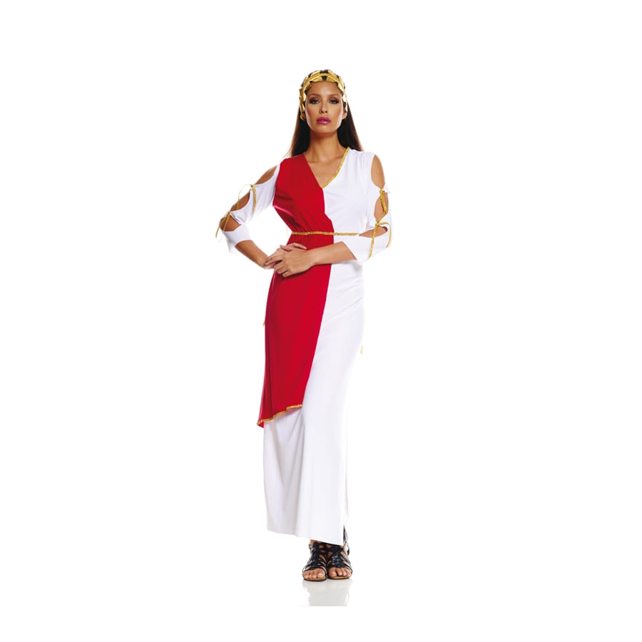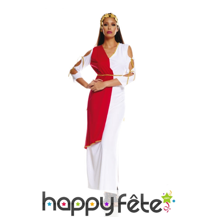 D'une beauté envoûtante, d'une élégance modèle et d'une sensualité enivrante, la femme romaine arbore une apparence sexy et classe. Vous aussi, adoptez ce look avec cette longue tenue de romaine blanche et rouge. Ce costume est composé d'une longue robe près du corps, tout en blanc, ainsi que d'une toge d'une belle couleur rouge vive. Les manches en 3/4 sont à découpe et toutes les sections sont reliées entre elles par de fins rubans dorés. A la taille, une ceinture dorée vient accentuer le coté glamour de la tenue, mais aussi pour rajouter une touche de couleur. Pour parfaire le tout, le costume comprend une couronne de lauriers qui est typique de la culture romaine. Des spartiates pour femmes sont à retrouver sur le site pour compléter ce beau costume.