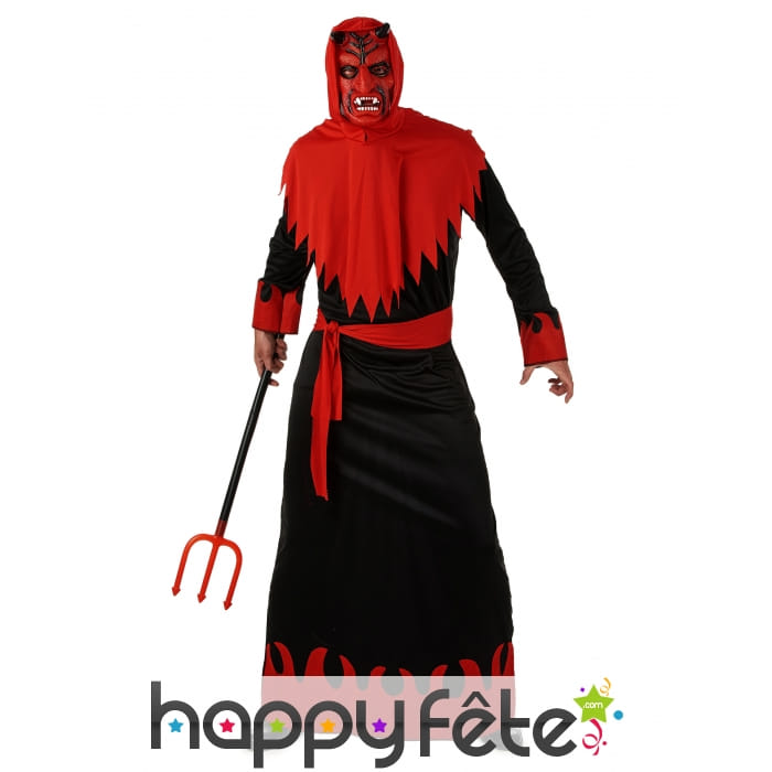 La longue tenue noire et rouge de diable pour adulte constitue un costume dédié à la fête des morts. Elle reste disponible sur notre site. Cet article se compose d'une longue robe noire. Elle présente des motifs de flamme rouge sur ses bords et sur les extrémités des manches longues. Sa taille se trouve marquée par une ceinture rouge qui se noue. Elle est assortie à la cape à capuche de la même couleur. Cette dernière, découpée en dents de scie au niveau des bordures, donne un effet déchiqueté. Un masque rouge de diable vient s'ajouter à l'ensemble. Il a deux petites cornes en relief sur le front.