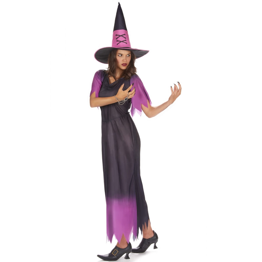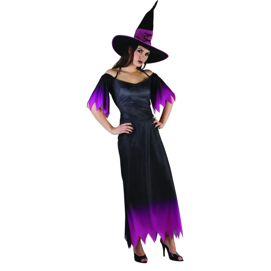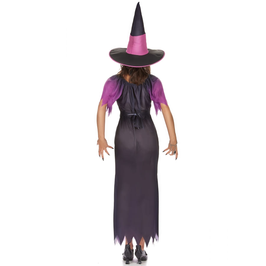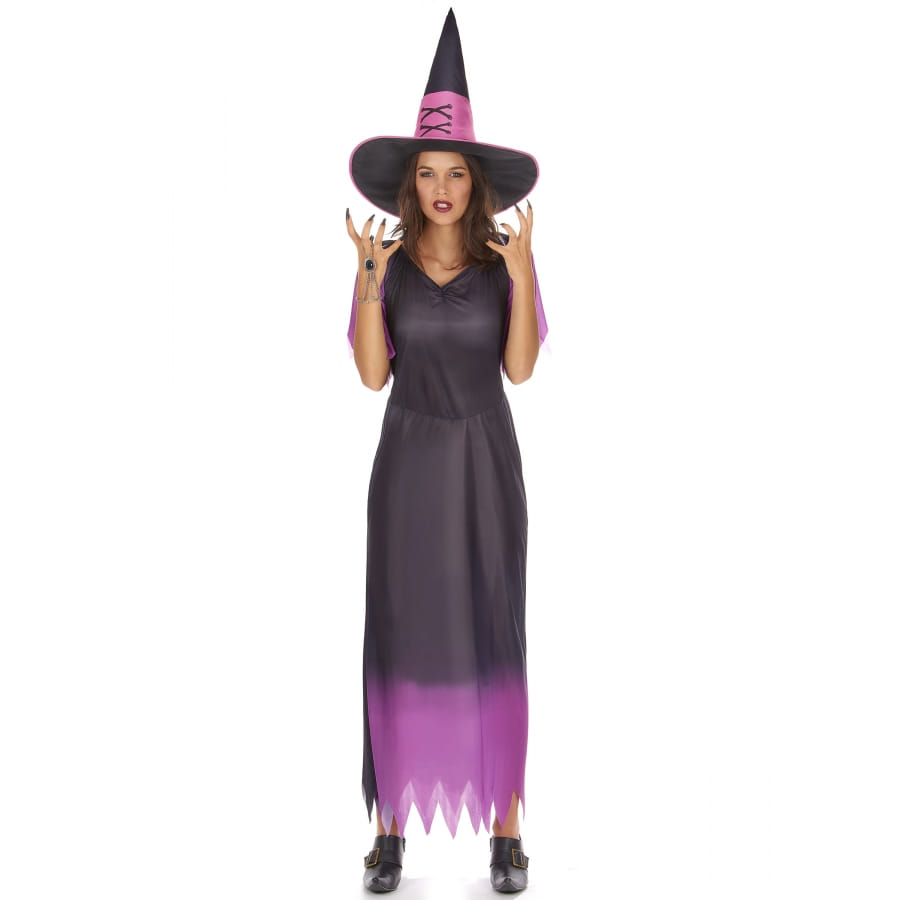 Rien de tel qu'un déguisement de sorcière pour accueillir la fête des morts ! Cependant, encore faut-il qu'il soit original. De ce fait, si vous recherchez un tel article, nous pouvons répondre à vos attentes. En effet, nous vous proposons cette longue tenue violette de sorcière adulte. Elle reste disponible sur notre site. Elle comprend une longue robe à manches courtes. De couleur violette foncée en général et claire sur les extrémités, le tissu utilisé offre un joli dégradé qui vous fera sortir du lot. Ses bords ont été déchiquetés en dents de scie pour lui donner encore plus de style. Un chapeau de sorcière à longue calotte pointue accompagne cette tenue. Le même tissu utilisé pour la robe a été repris afin de l'y assortir.