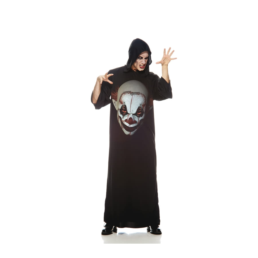 Messieurs, si vous êtes à la recherche d'un costume simple mais qui fait vraiment peur, Longue tunique motif clown horrible est ce qu'il vous faut ! Le déguisement est composé d'une longue tunique noire unie qui tombe jusqu'aux chevilles. Il est également doté d'une capuche qui vous rendra très mystérieux. L'ensemble vous donnera des allures de grande faucheuse terrifiante. L'horreur du costume est accentuée par la tête de clown très effrayante qui s'étale sur la poitrine de la tunique. Vous ne manquerez pas de faire peur à tout votre voisinage !