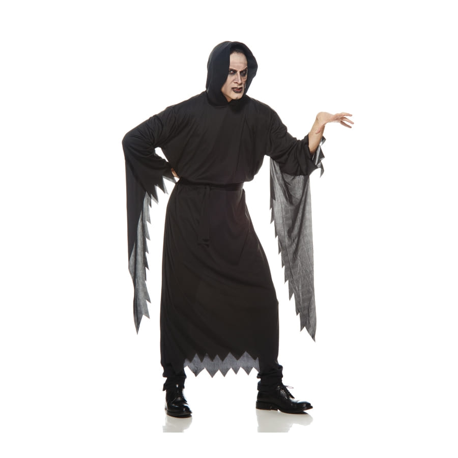 Choisir un déguisement pour Halloween n'est jamais facile, surtout avec la multitude de choix qui s'offre à vous. Pour faire simple, rien ne vaut un costume simple qui s'enfile aisément. C'est le cas de cette longue tunique noire de fantôme avec manches chauve-souris frangées. La découpe à dents de scie des bords amplifient l'effet thriller. Il est parfait pour effrayer les petits enfants. A travers la ville, vous allez vous prendre pour ce meurtrier mystérieux grâce à son masque à capuche. Il inclut également une ceinture. La matière du tissu est à 100% en polyester.