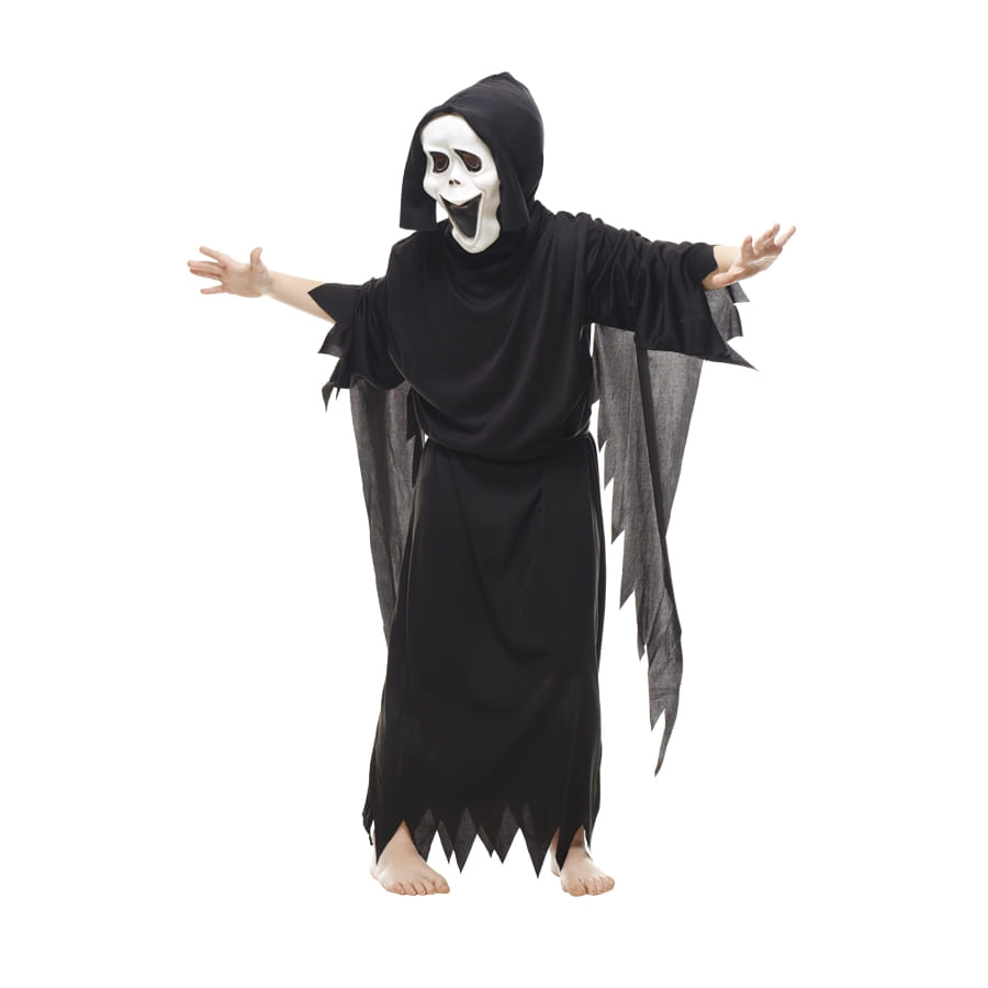 Vous en avez sûrement entendu parler : un meurtrier mystérieux rôde dans la ville ! Sous cette longue tunique noire de fantôme pour enfant se cache le mystérieux personnage. Inspiré d'un film d'horreur, ce déguisement sous licence Scream a spécialement été créé pour les petits garçons. Pour une nuit d'Halloween sans pareil, votre fils devra enfiler cette longue robe de couleur noire avec capuche. Elle présente des motifs découpés sur ses bords et elle est dotée de très longues manches qui pendent. Le résultat est troublant lorsque l'on écarte les bras. Un masque blanc de fantôme est fourni avec la robe. Votre fils en effraiera plus d'un grâce à ce déguisement !