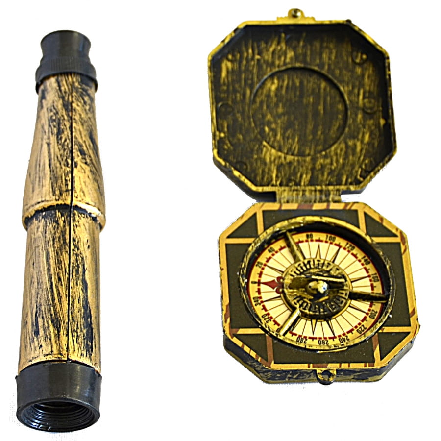 Comment les pirates faisaient-ils pour naviguer dans les mers inconnues ? Pour mieux retrouver votre chemin, optez pour ce set de pirate qui va joliment compléter votre costume de pirate. Vous disposerez d'une longue vue or et bronze faisant 19 cm de long, ainsi que d'un compas de 6 x 6 cm de dimension qui arbore la même couleur. Les eaux et les terres n'auront désormais plus de secrets pour vous !