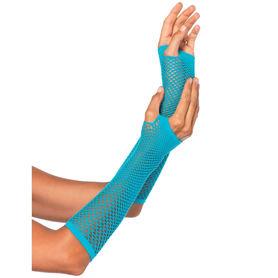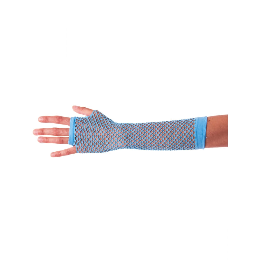 Les longues mitaines bleues fluo en résille pour adulte mesurent 30 cm.