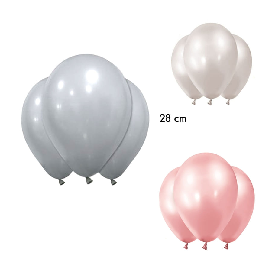 Vous pourrez obtenir le lot de ballons en trois couleurs au choix: argent, rose métallisé ou blanc métallisé.
