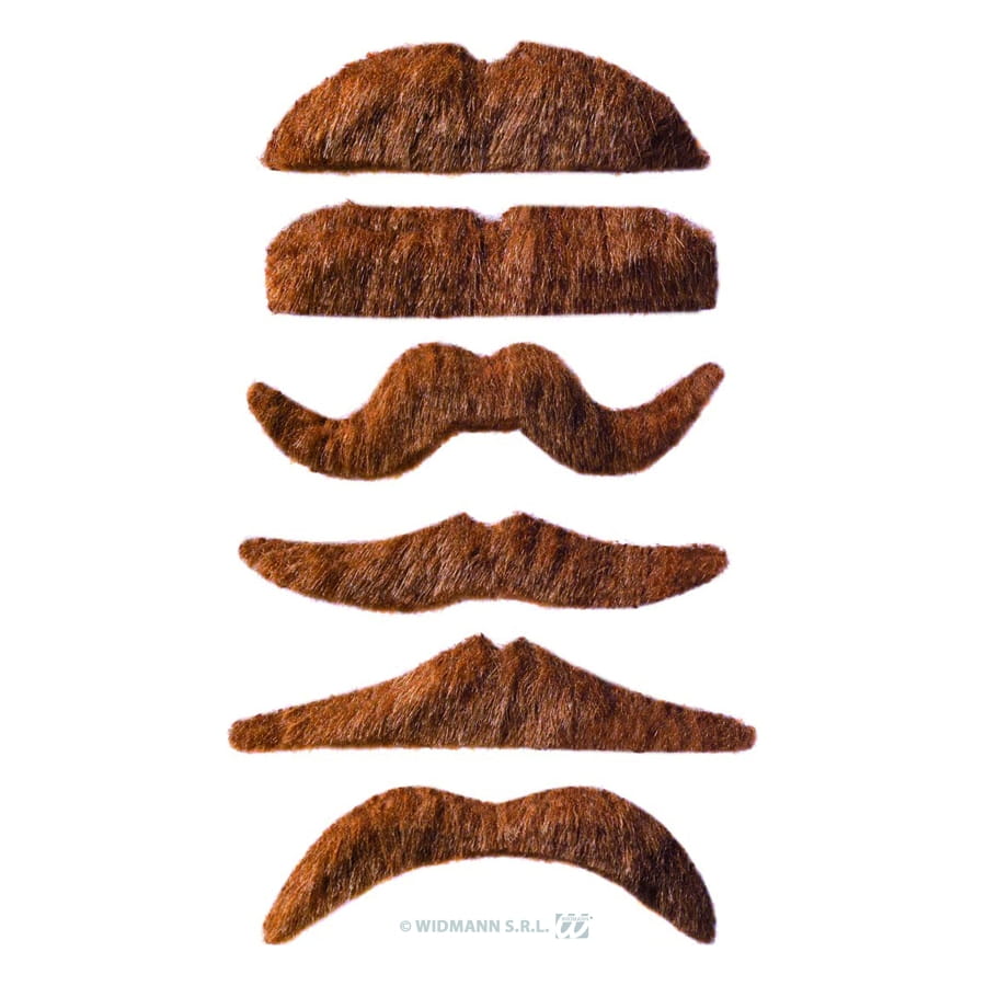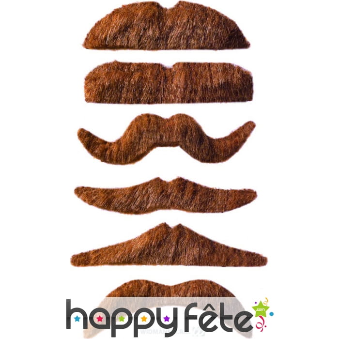 Ces moustaches sont vendues en lot de 12, auto-adhésives elle vous permettrons de changer de style autant de fois que vous voulez. Ces six modèles assortis vous permettront de varier, vous pourrez ainsi incarner un cowboy, shérif, paysan, prêtre, policier, mousquetaire, ce que vous voulez. De couleur châtain clair, il y a six modèles assortis.