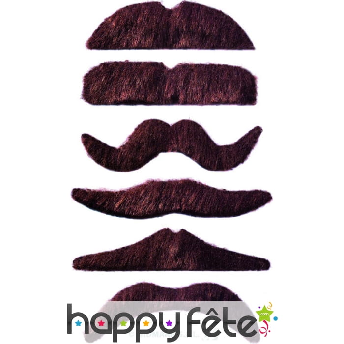 Un pack de douze moustaches pour créer le style que vous voulez. Vous pourrez vous en servir à différentes occasions. Ce lot de 12 moustaches est composé de 6 modèles assortis, elles sont auto-adhésives de couleur châtain. Vous pourrez peaufiner votre déguisement de policier, motard, cowboy grâce a ces moustaches.