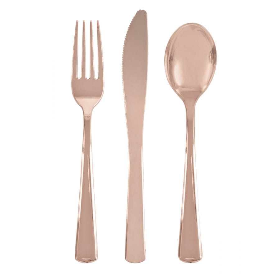 Le lot de 18 couverts rose doré en plastique sera parfaite pour accompagner une éblouissante déco de mariage ou de nouvel an.