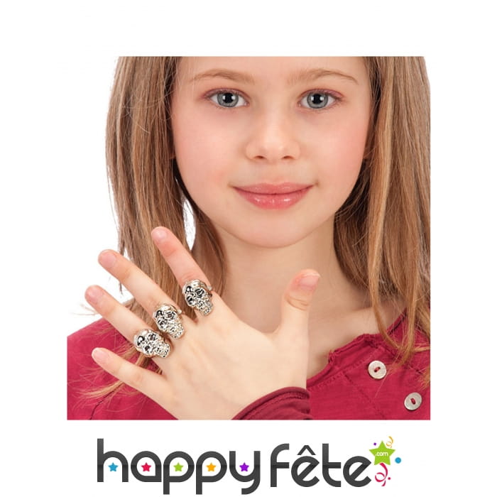 Ces bagues de couleur argent possèdent chacun un chaton en forme de tête de mort.