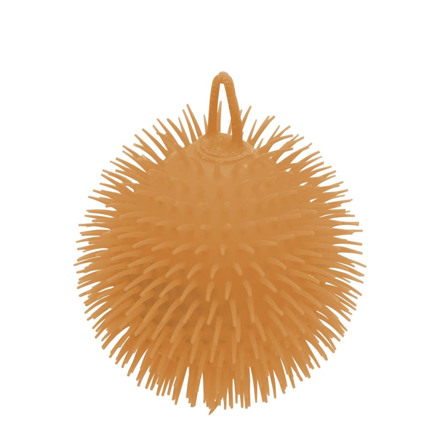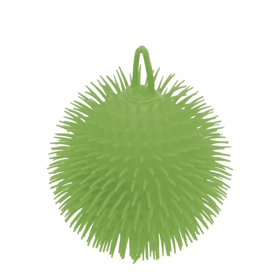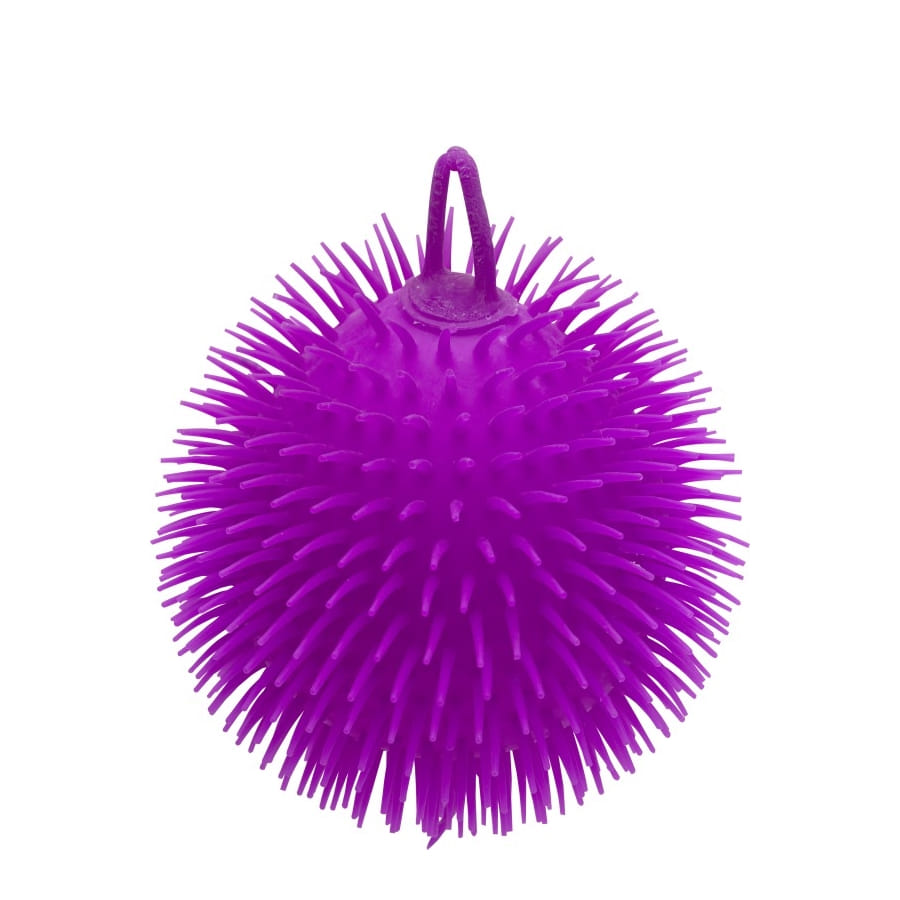Grosse boule en plastique mou de couleur violet néon, avec piques. Ce petit jouet mesure 20 centimètres de diamètre et l'intérieur est éclairé d'une lumière.