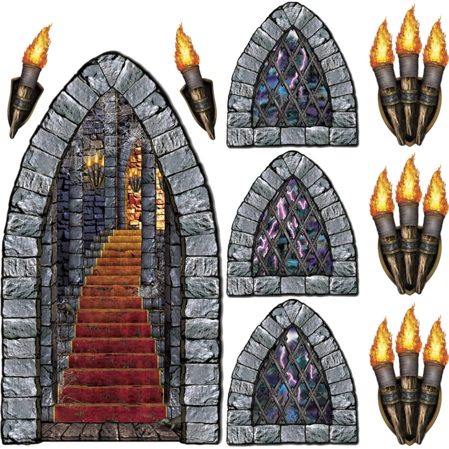 Lot de 9 décorations de couleur argentée et jaune. La taille de ces décorations varie entre 45 centimètres et 150 centimètres. Une fois installée, vos invités auront l'impression d'être dans un vrai donjon médiéval.