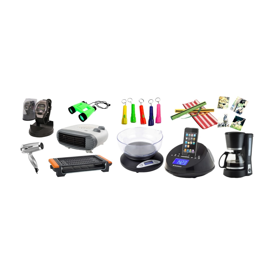 Qui aura la chance de gagner à la loterie ? Voici tout un équipement complet pour orner votre stand de kermesse. Organiser une loterie n'est pas une mince affaire, mais avec cet attirail, vous vous en sortirez. Vous disposerez d'un ensemble de 500 tickets à gagner avec 100 tickets offerts, une grille de barbecue, 2 stations radio réveil pour iPhone ou iPod, une cafetière d'une puissance de 550 W, un sèche cheveux de 1200 W, 3 balances culinaires, 1 montre digitale, 12 porte clefs, 1 matelas de plage, une jumelle couleur, un mixeur à main d'une puissance de 200 W et 6 carnets blocs notes. Tout cela saura combler les heureux gagnants !