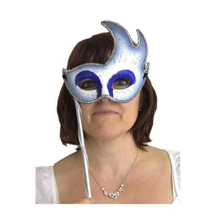 Si vous allez assister à un simple bal masqué, nul besoin d'avoir un de ces masques extravagants. Un loup face à main que vous pourriez poser dès que l'envie vous en prendra fera l'affaire. Ce loup, que nous avons ici, est chic mais sans excès. Il est de couleur bleu dégradé jusqu'au blanc, avec des petits ornements en paillettes argentées. Le manche est également argenté. Sa dimension est de 34 cm.
