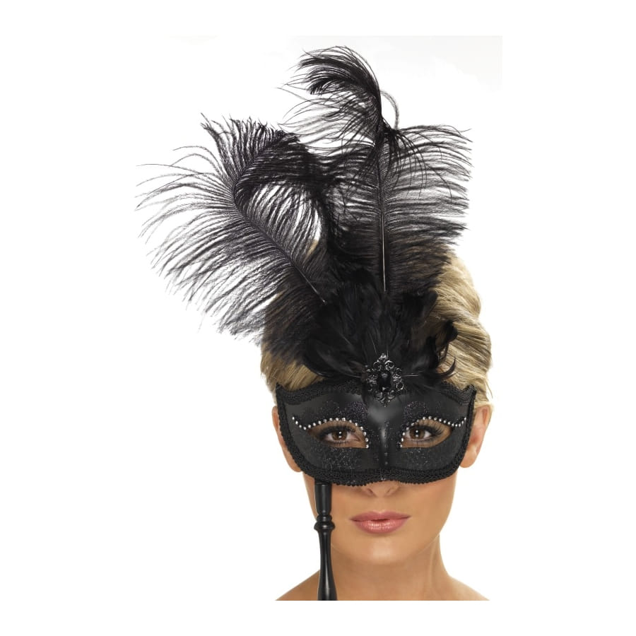 Pour une soirée rempli de mystère, ce loup à main vous servira. Vous pourrez aussi incarner une charmeuse ou si vous partez à une fête ayant pour thème Venise, il pourra aussi vous être utile. Ce loup à main , avec une manche, il y a une bordure argenté sur le contour de l’œil et des plumes noire au centre du loup.